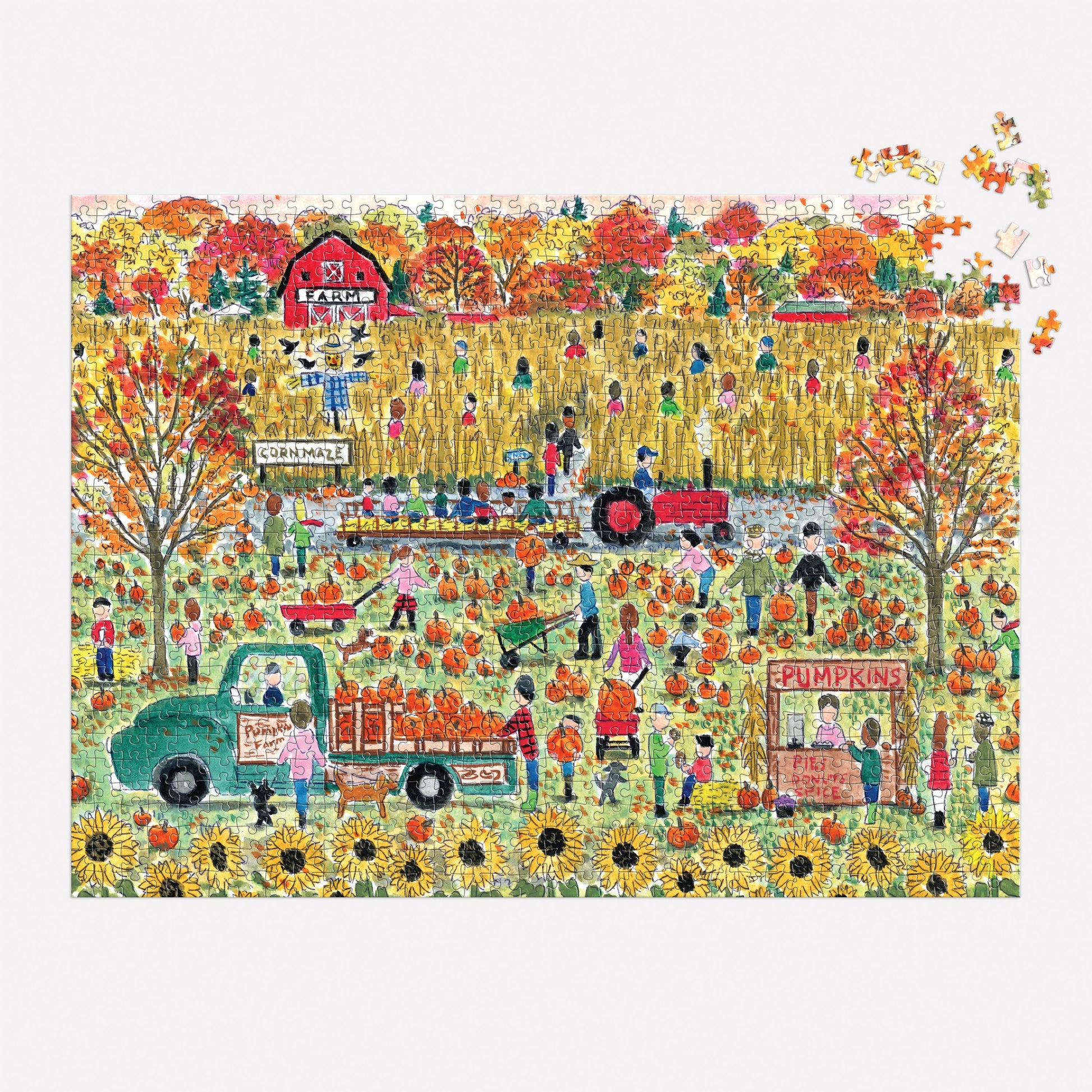 1000 PIECE PUZZLE – Michael Storrings Pumpkin Patch 1000 Piece Puzzle by Galison features a day at the pumpkin patch, celebrating the bounty of the season. This puzzle is just the right level of challenge for the whole family to join in on for hours of puzzling fun! The box includes an insert with the full puzzle image for reference.